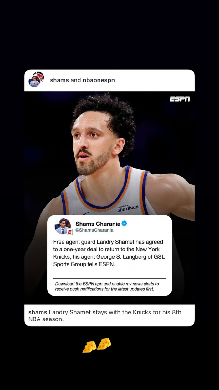 尼克斯球星米卡尔-布里奇斯在个人社媒转发了这条信息,并配了2个奶酪表情。