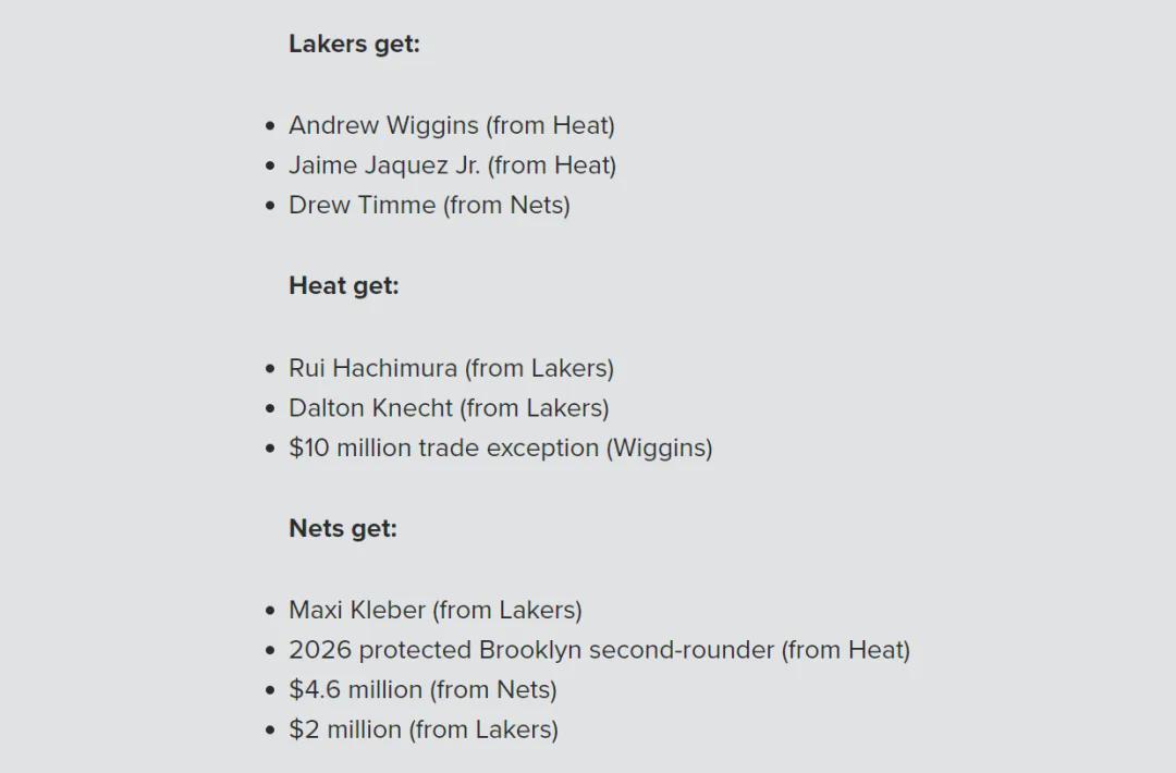 篮网得到克莱伯(来自湖人)、1个受保护次轮签(来自热火)、460万美元现金(来自热火)、200万美元现金(来自湖人)。湖人相当于用八村垒、克莱伯、克内克特、200万现金,换来维金斯跟哈克斯等人。问题是热火答应吗?