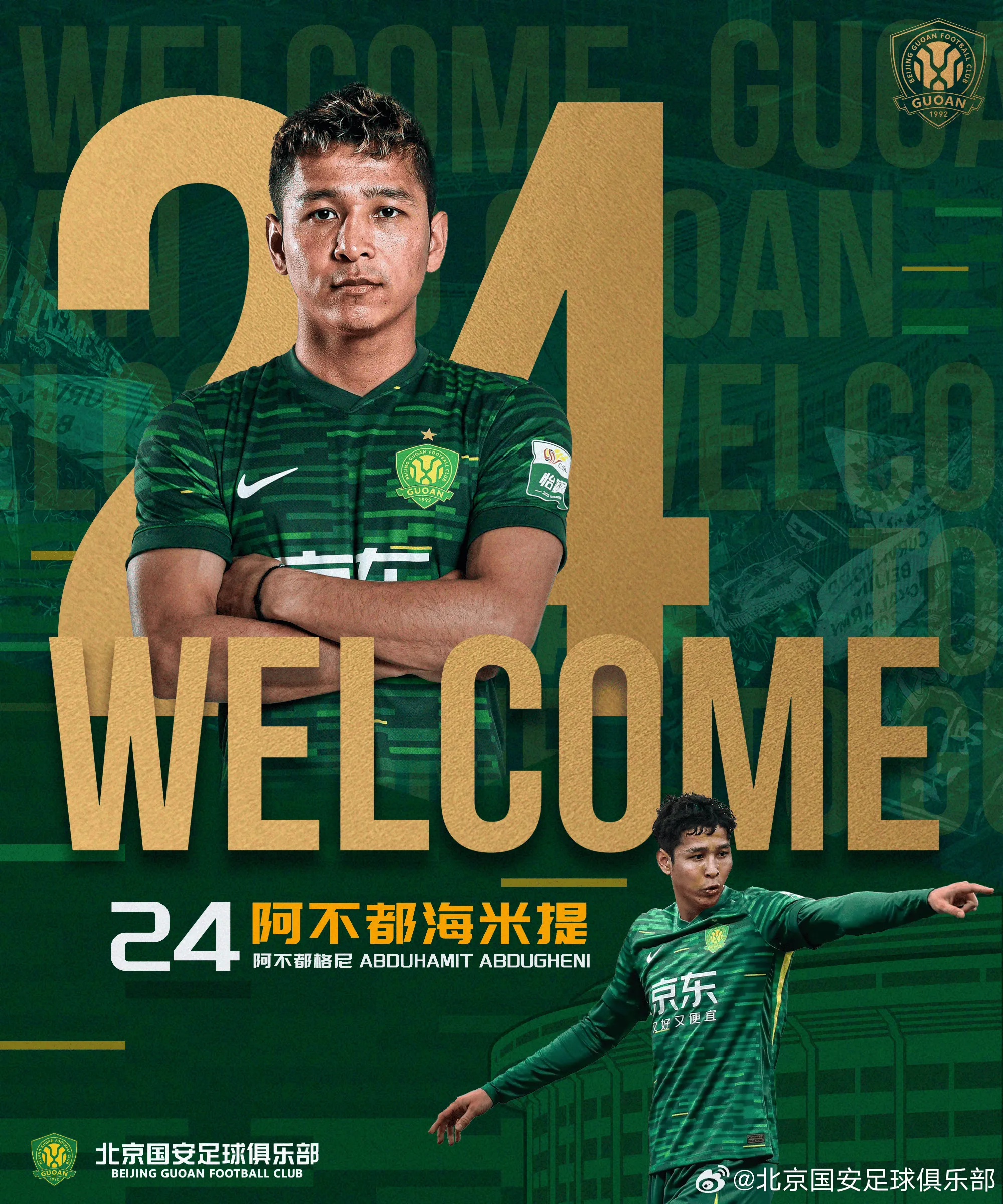 阿不都海米提·阿不都格尼正式加盟北京国安足球俱乐部,他将身披24号球衣,代表北京国安出战本赛季中超联赛、亚冠联赛、足协杯等各项赛事。