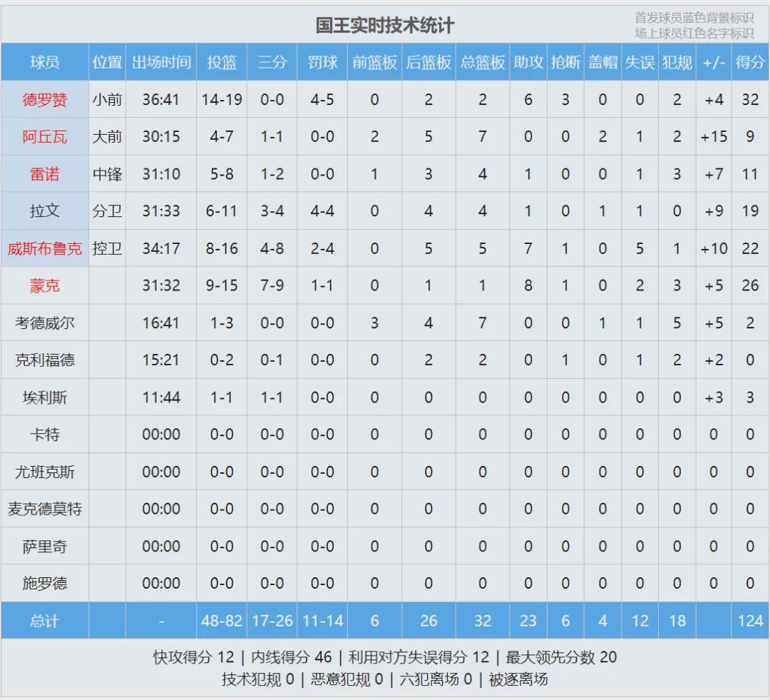 第四节威少和拉文命中率下降,湖人夹击德罗赞。湖人自己进攻效率也不高,最后2分钟,蒙克和阿丘瓦三分打进,国王领先到16分。湖人换下主力,布朗尼在垃圾时间三分2中2。全场结束,国王124-112击败湖人,背靠背连克火箭和湖人。