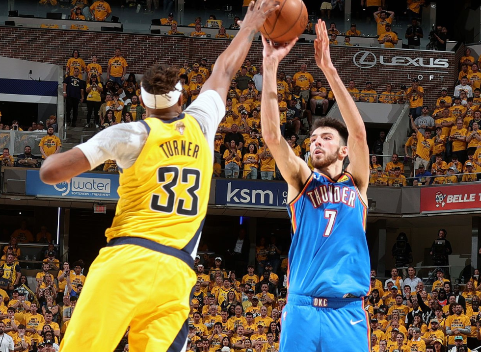 老派NBA球迷或许会欣赏本次总决赛对三分线的关注转移。在这个“三分多者常赢”的时代,本次系列赛却无明显规律:步行者的两场胜利分别伴随系列赛最佳(G1的39中18)和最差(G3的27中9)的三分表现;雷霆场均三分命中数比常规赛少近3个(11.7vs14.5),但命中率更高。