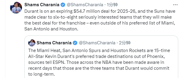 此前,The Athletic的三位专家表示,杜兰特有两个首选交易下家:马刺、火箭。但他们也表示,马刺和火箭的报价目前无法让太阳满意,交易难度很大。另有报道称,杜兰特不愿前往森林狼。