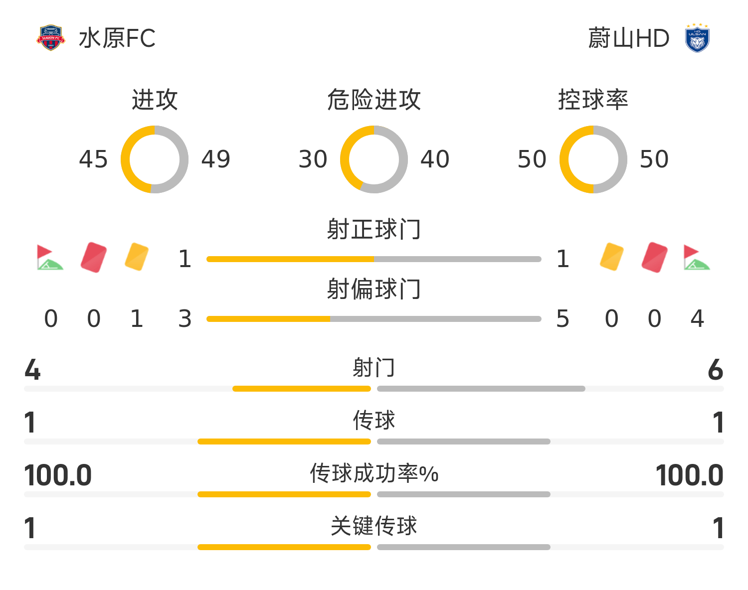 水原FC首发阵容:1-黄在闰;2-李镕;6-崔圭伯;4-金台翰;21-徐在民;44-威廉;15-安德里戈;7-李在元;18-韩赞熙;97-迪亚斯;9-萨巴格