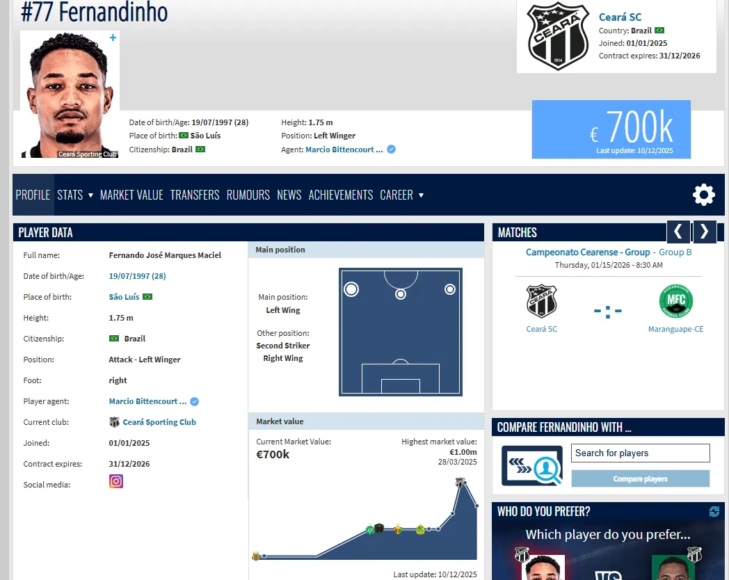 身披塞阿拉球衣的费尔南迪尼奥已出场39次,攻入4球并贡献2次助攻。他曾与莫扎特在米拉索尔队并肩作战。效力于莱昂·凯皮拉队期间,这位前锋出场88次,攻入7球并贡献7次助攻。